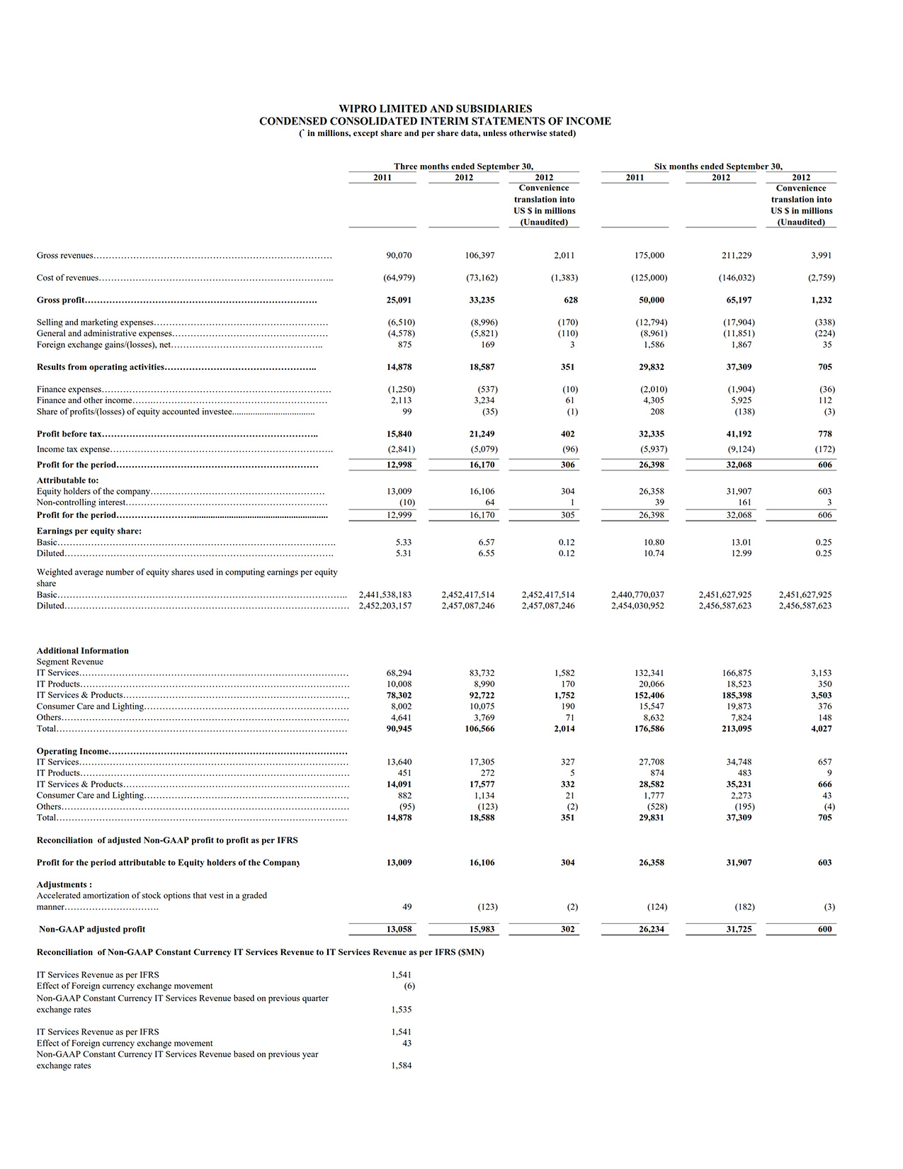 Results for the quarter ended June 30, 2013, computed under IFRS, along with individual business segment reports, are available in the Investors section of our website at www.wipro.com.