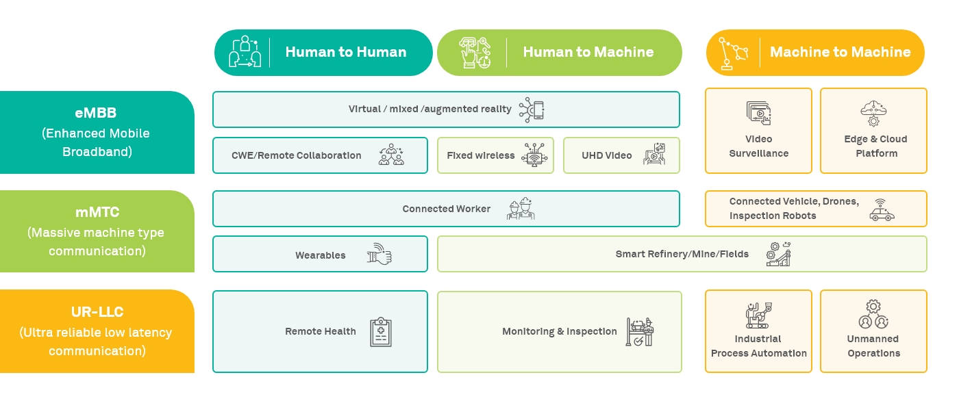 Enhanced Mobile Broadband (eMBB) – While aimed at entertainment such as video social networking and multimedia communications with higher resolution video channels, it has immense potential in the O&G industry, especially to adopt video-based surveillance in asset operations.