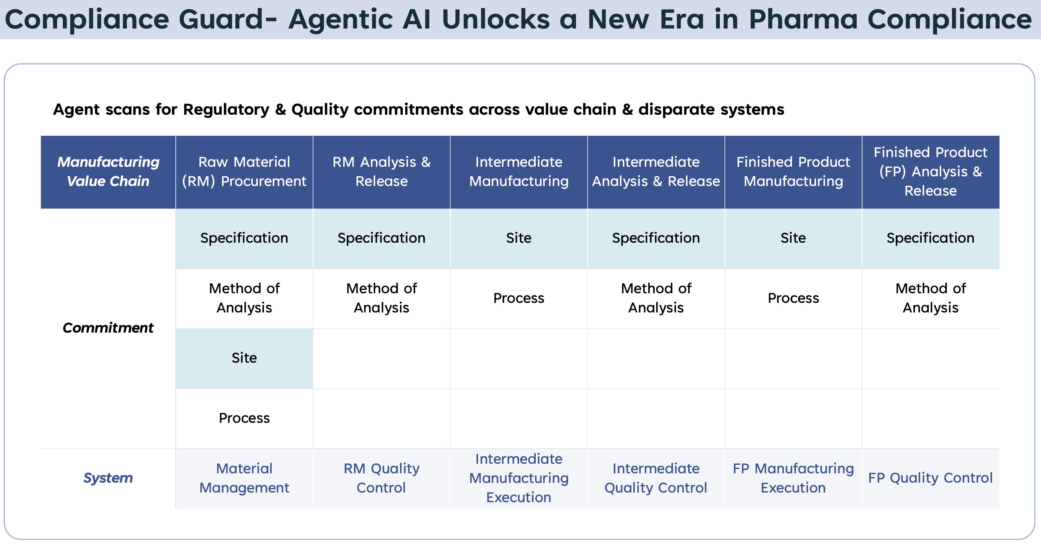 Agentic AI integrates fragmented data spread across disparate systems, such as ERP, LIMS, QMS, and document repositories, into a cohesive and real-time data fabric. This unified view ensures traceability, consistency, and audit-readiness, allowing stakeholders to make informed decisions based on a single source of truth.