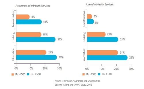 The graph below indicates the current use of mHealth in delivering services for information, enabling and transformative healthcare in India to various income groups. Information services, generally offer one-way communication or message-board style question and answer services. Enabling services start to function as substitutes for traditional care and transformative services enable the collection of objective healthcare data.
