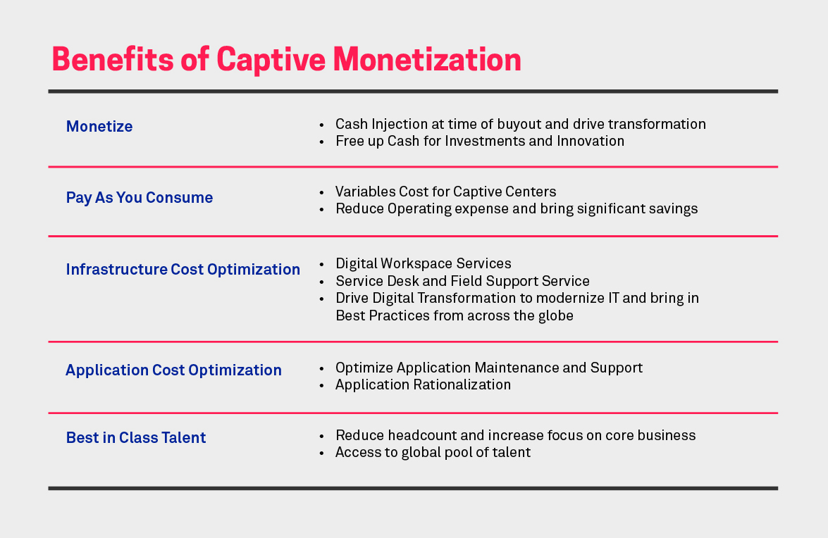 Having a captive at a time like this may not provide the strategic solutions it once did for manufacturers. These organizations can use a Captive Monetization strategy to ensure cost optimization. In this strategy, a System Integrator (SI) takes over captive operations and pays the client for the value of the captive’s assets (center, real estate, hardware, software, and employees). The client then contracts with the system integrator for the delivery for software projects.