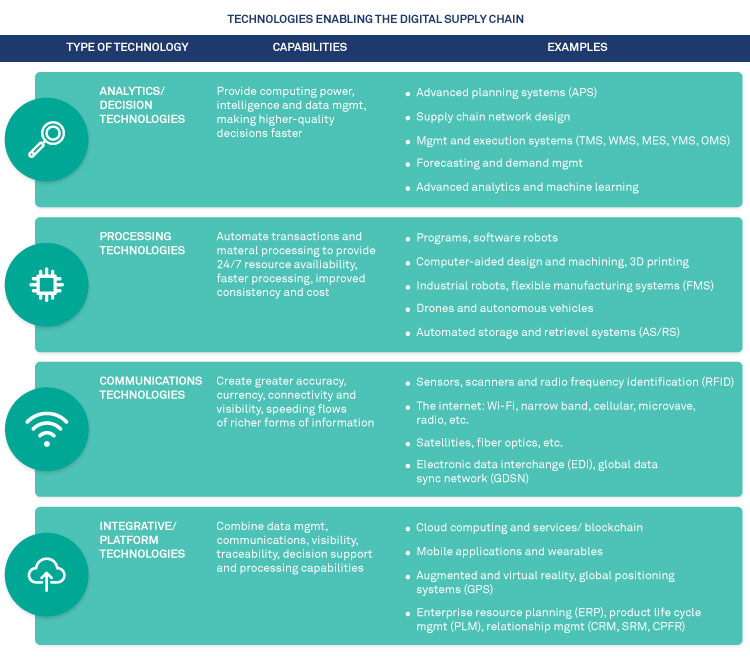 Embedded within this definition are fundamental notions of dematerialization, automation, and AI. Within the following sections, we describe the important core attributes and digital technologies that are defining and driving digital supply chain transformation.
