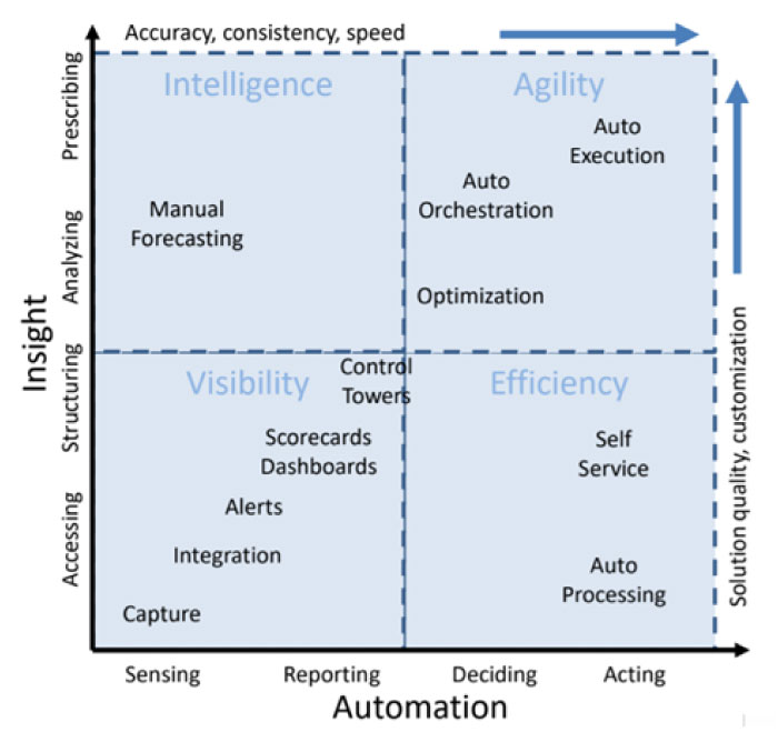 We map these capabilities along two core dimensions of technology enablement: automation and insight. Many technologies automate decisions and actions, including computations, transactions, data capture, physical transformations and movements, and more. Automation substitutes capital for labor in ways in which it improves efficiency and quality by lowering costs, speeding-up processing and transitions, improving consistency, and increasing resource availability. Technologies that improve insight increase visibility and intelligence by connecting stakeholders, structuring and sharing information, and cognifying processes, that is, developing knowledge through analysis and learning. In its most essential form, digital transformation is about developing automation and insight to radically advance visibility, intelligence, efficiency, and customer experience and agility, as well as customization.