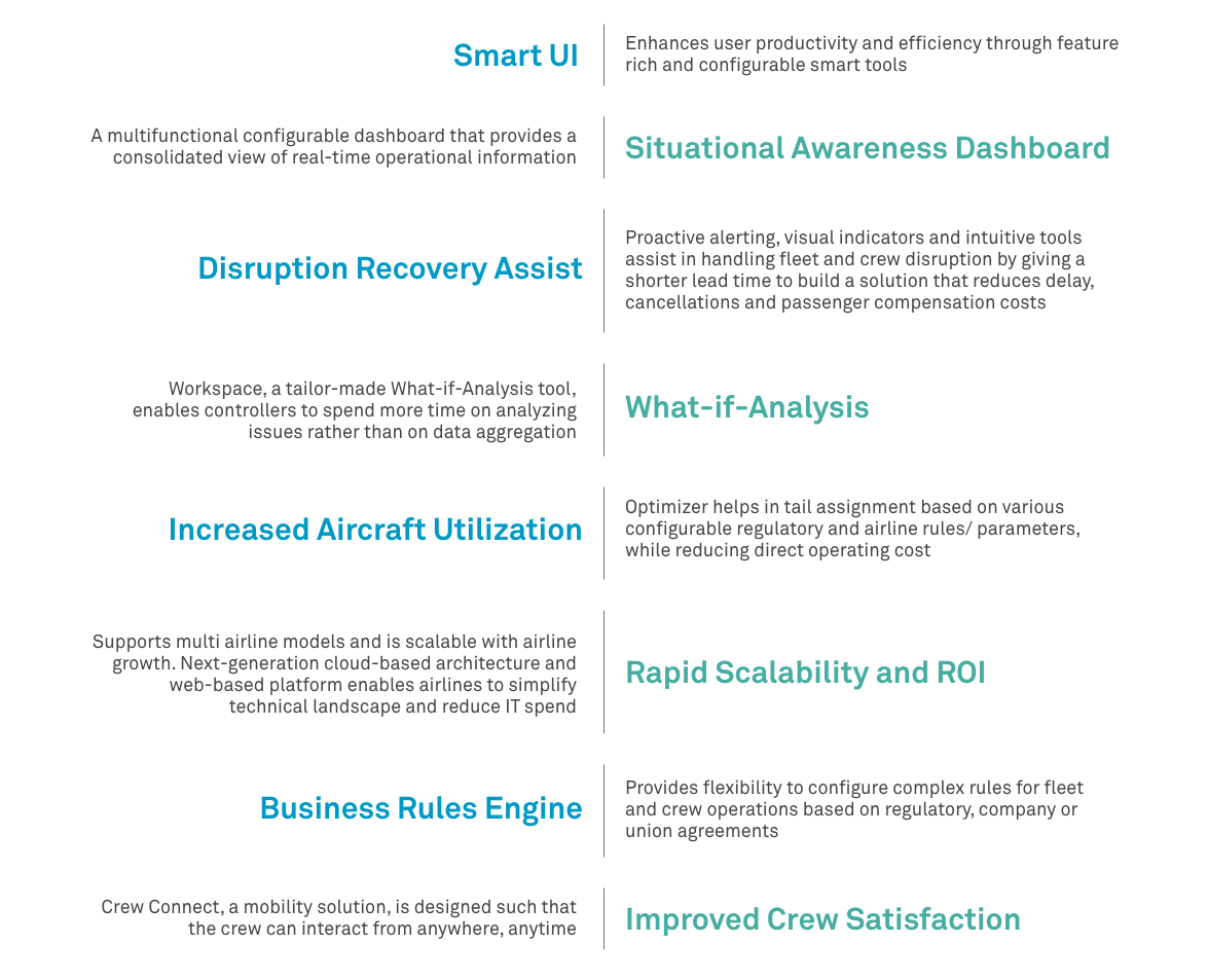 TOPS is a web-based integrated solution suite designed to plan, monitor, anticipate, and manage the airline’s (and airline groups) end-to-end flight and crew operations to achieve maximum efficiency and profitability, while ensuring safety. TOPS provides an efficient interface engine to integrate with various data sources, ensuring availability of accurate information for collaborative decision-making. It provides real-time statistics and situational alerts to improve utilization and productivity, and mitigates errors to improve on-time performance and reduce direct operating costs.