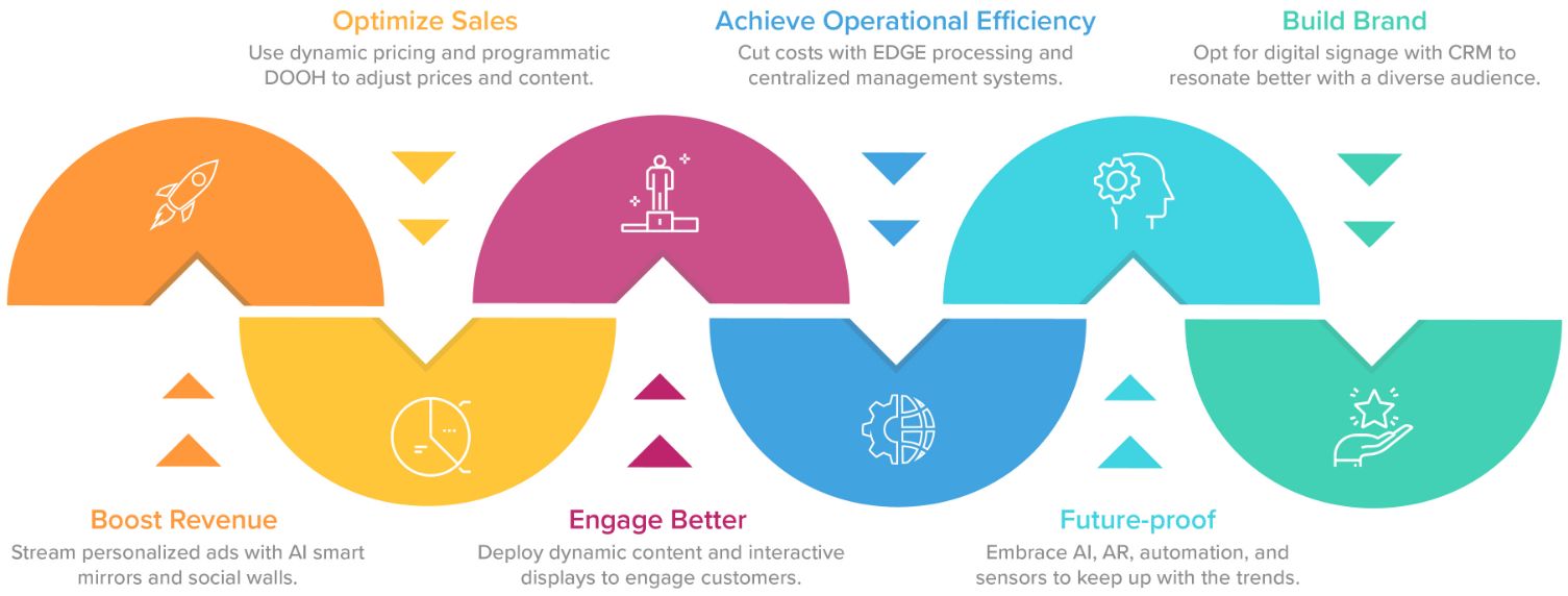 VisionEDGE+ elevates customer delight and retention through dynamic digital signages that facilitate in-store navigation, interactive promotions, gamified shopping experiences, and more. From small interactive monitors to large promotional walls, VisionEDGE+ powers centralized yet personalized user journeys through visually attractive targeted messaging in a faster, more flexible, and more cost-effective way.
